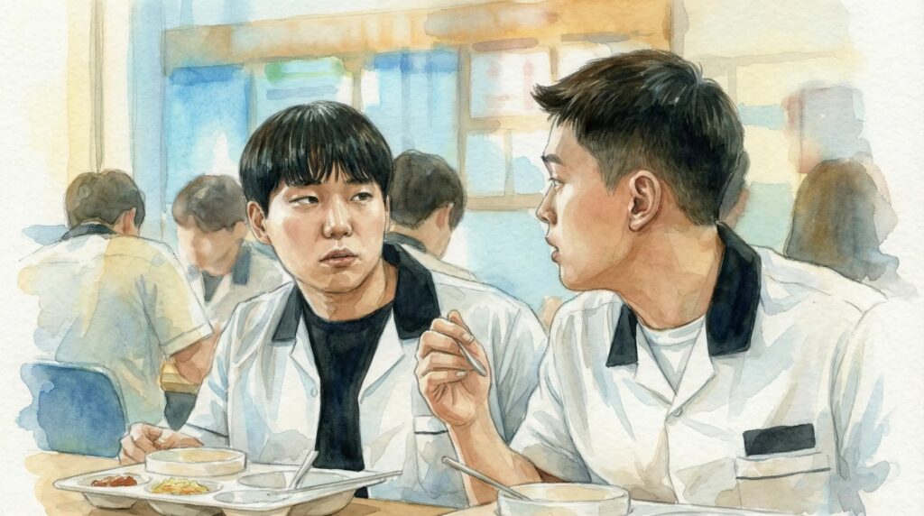 In the cafeteria, there was supposed to be an exchange where Suho gives Si-eun unsolicited training advice. Suho watches Si-eun and says, “Your surprise attacks are solid… but you gotta work on your stamina.” Then he demonstrates a pull-up motion—“Pull-ups—like this.”