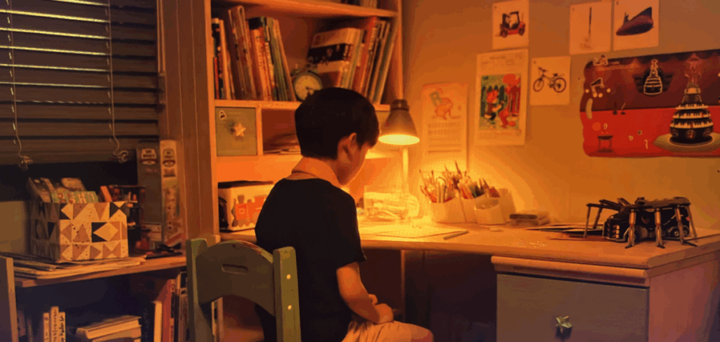 The boy’s study room is now bathed in that same lifeless blue light seeping out from a weak desk lamp.